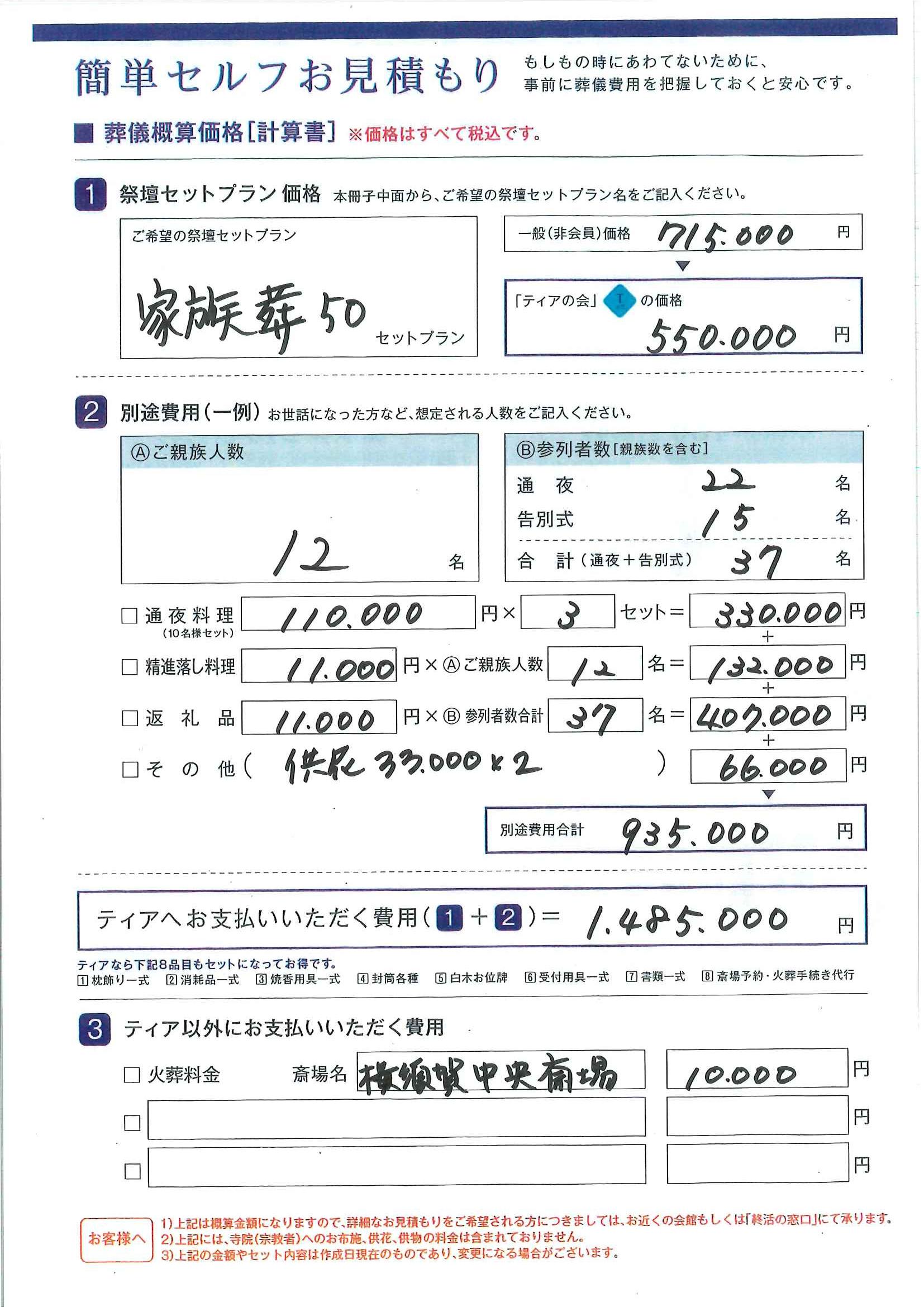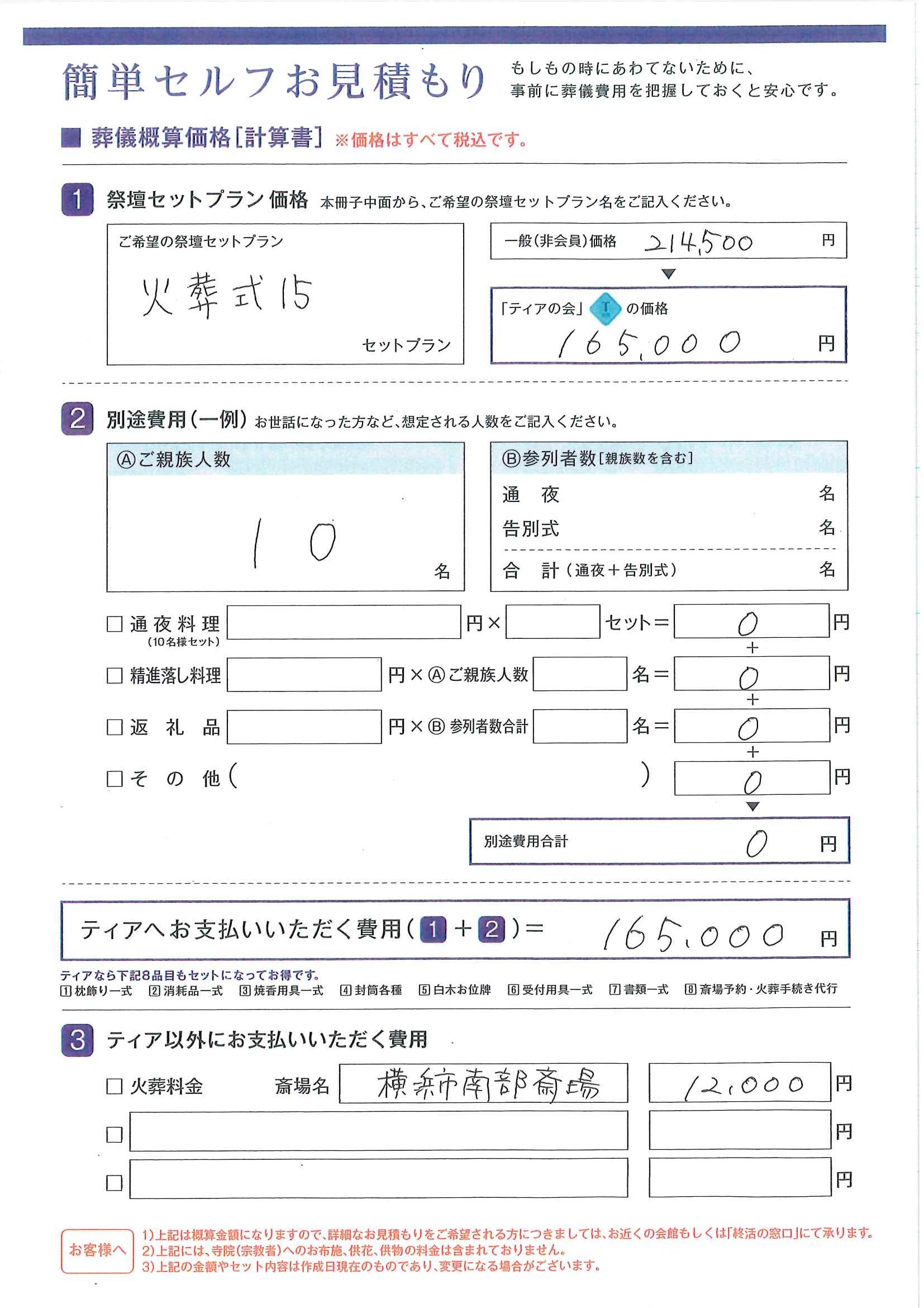 「セルフ見積もり」ボタンから、必要事項を入力するだけで葬儀費用の概算価格を簡単にご確認いただけます。